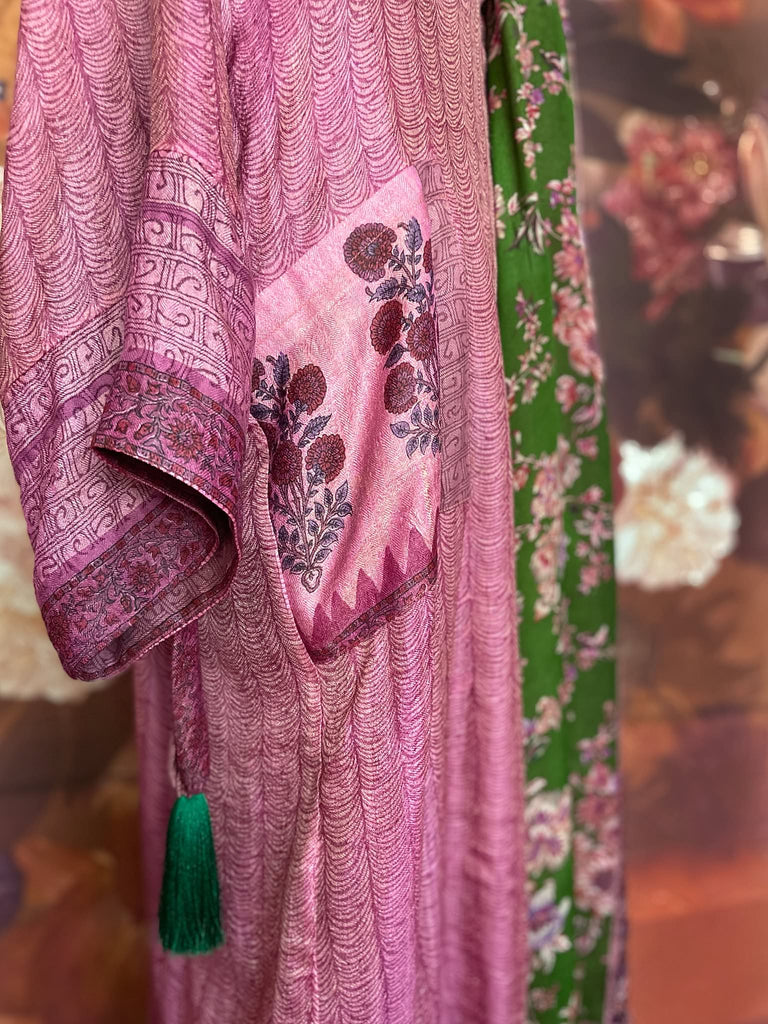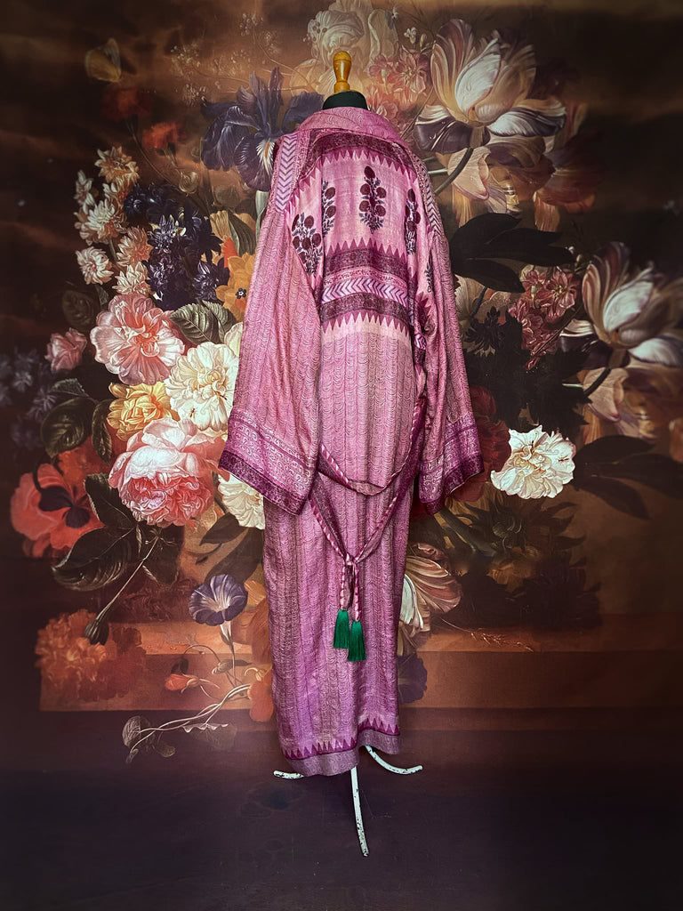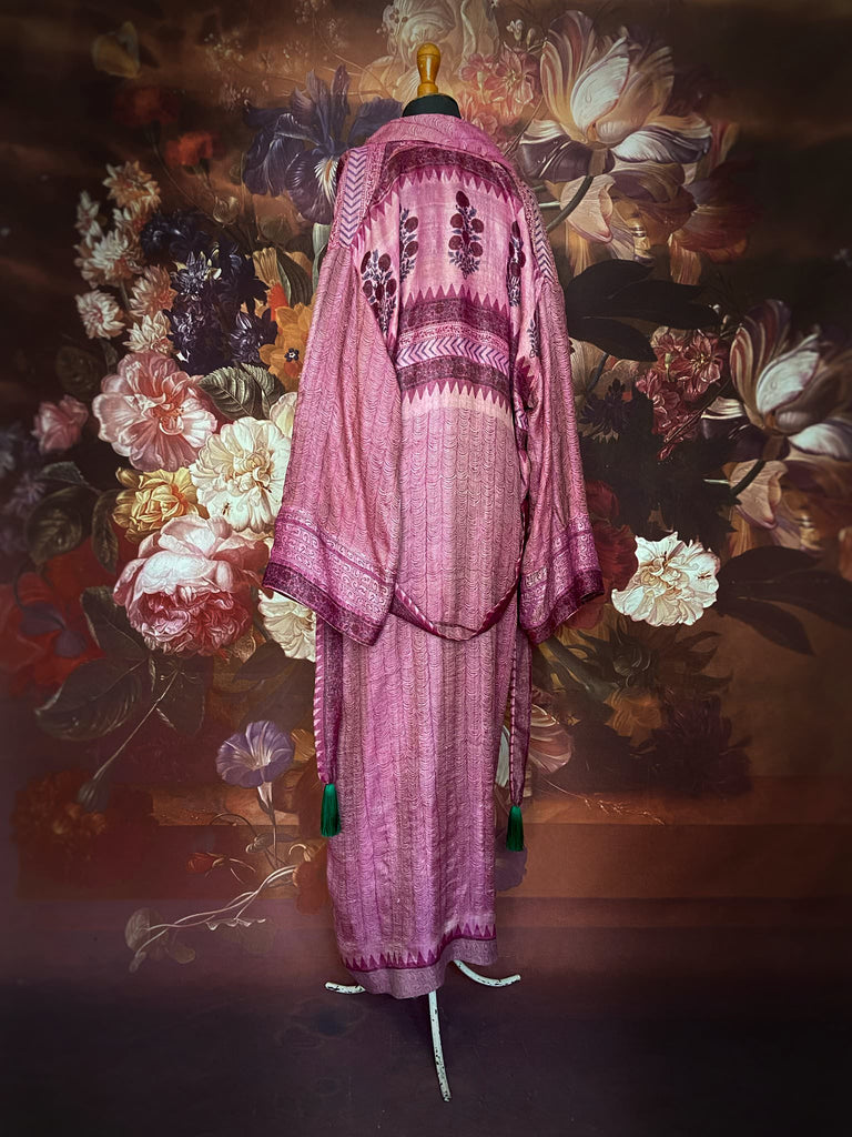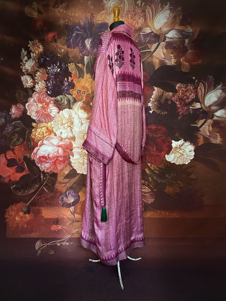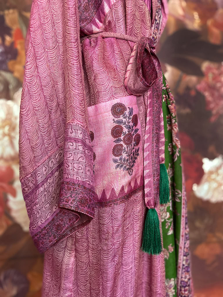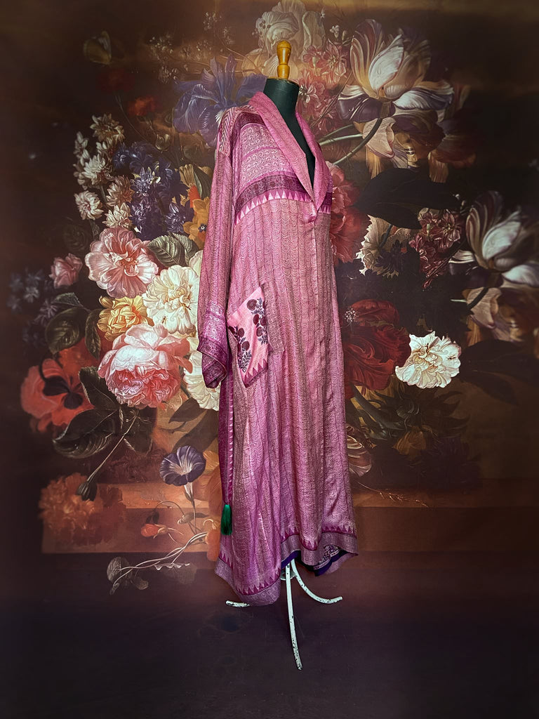A striking long generously cut dressing robe or duster coat with patch pockets and wide sleeves. Can be worn loose, or drawn in at at the waist with the long sash, finished with silky tassels.