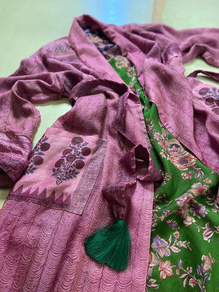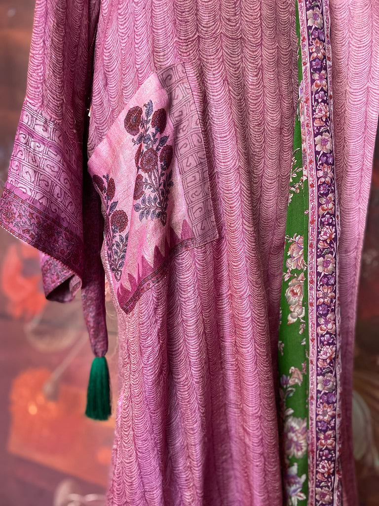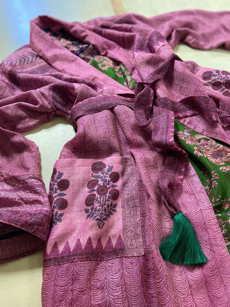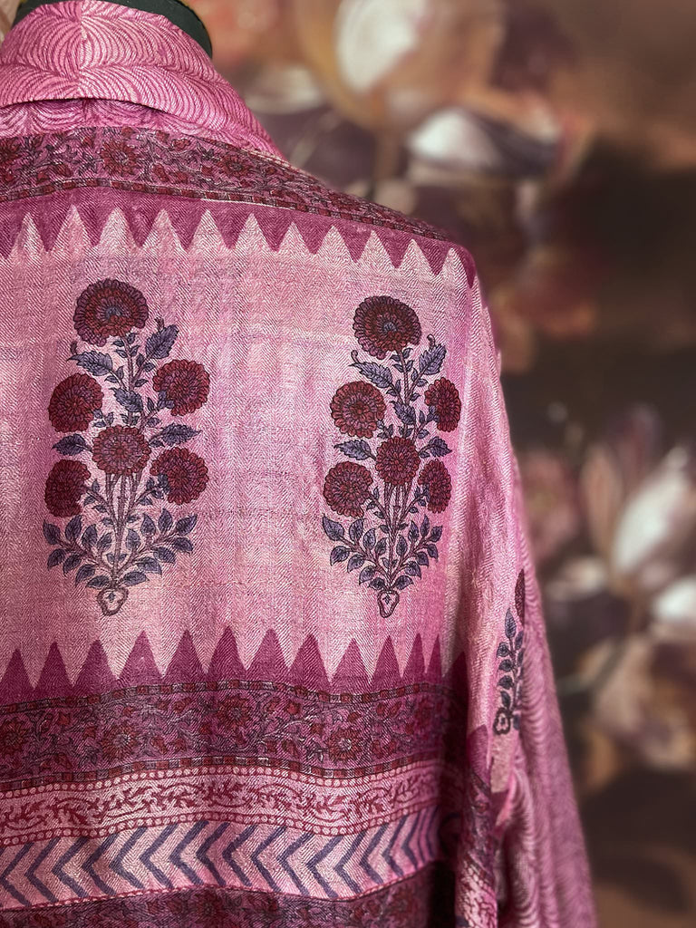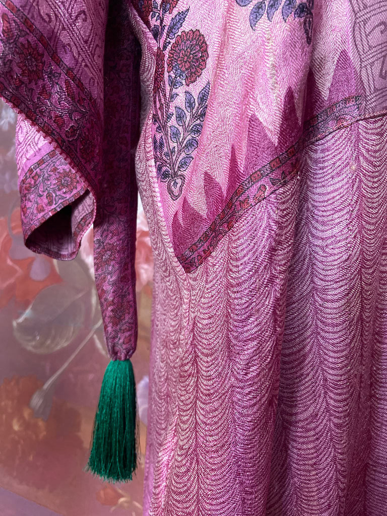 Each of these pieces is created from a vintage 100% wool saree. The design is very considered, with the cut engineered to make the best use of the various areas of beautiful printed design on the saree. I will spend some hours before cutting trying out different pattern layouts to ensure the most pleasing finished effect.