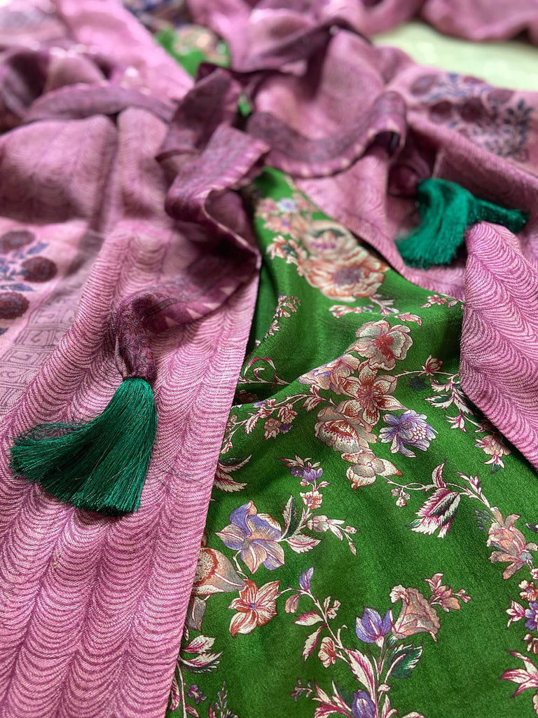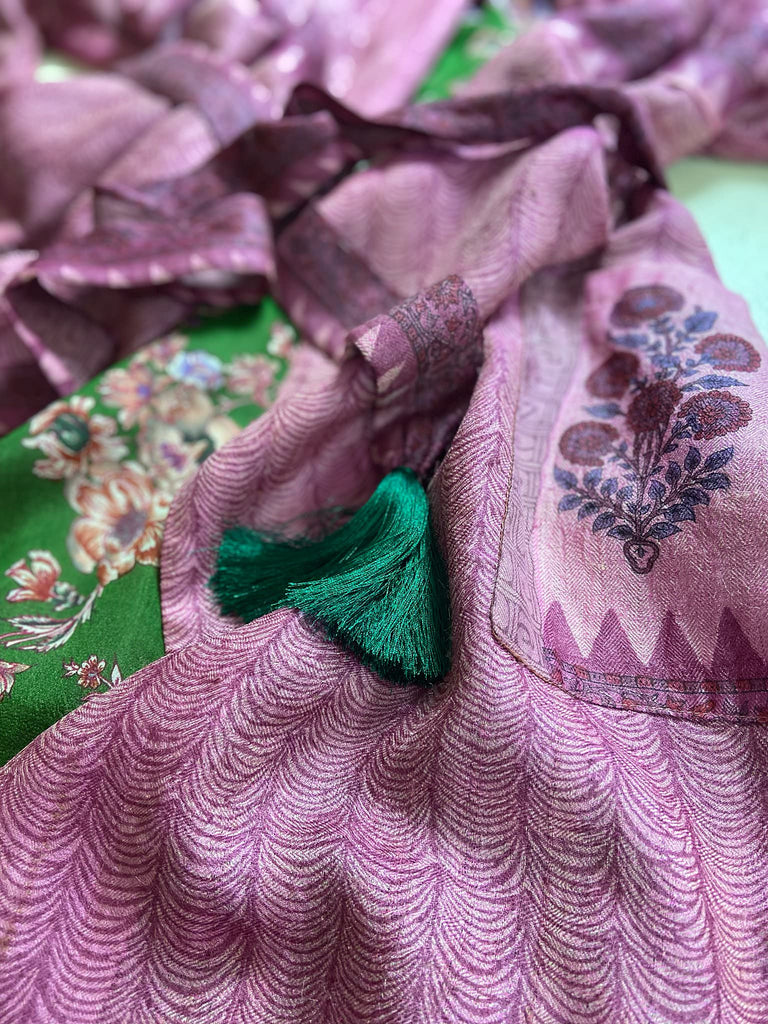 Supple fluid very lightweight fine wool. Banded geometric accents in complementary tones. Created from a carefully selected vintage wool saree.