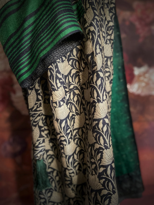 Supple fluid very lightweight fine wool. Banded geometric accents in complementary tones. Created from a carefully selected vintage wool saree.