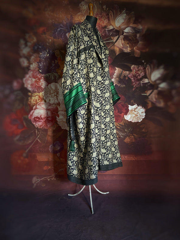 A striking long generously cut dressing robe or duster coat with patch pockets and wide sleeves. Can be worn loose, or drawn in at at the waist with the long sash, finished with silky tassels.