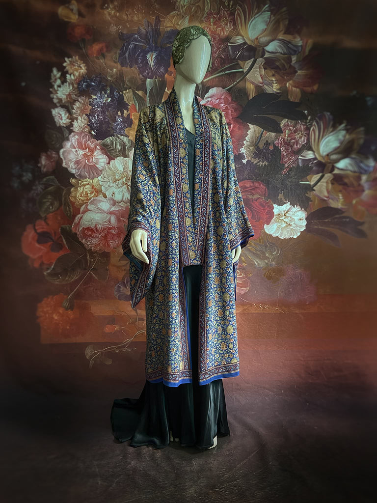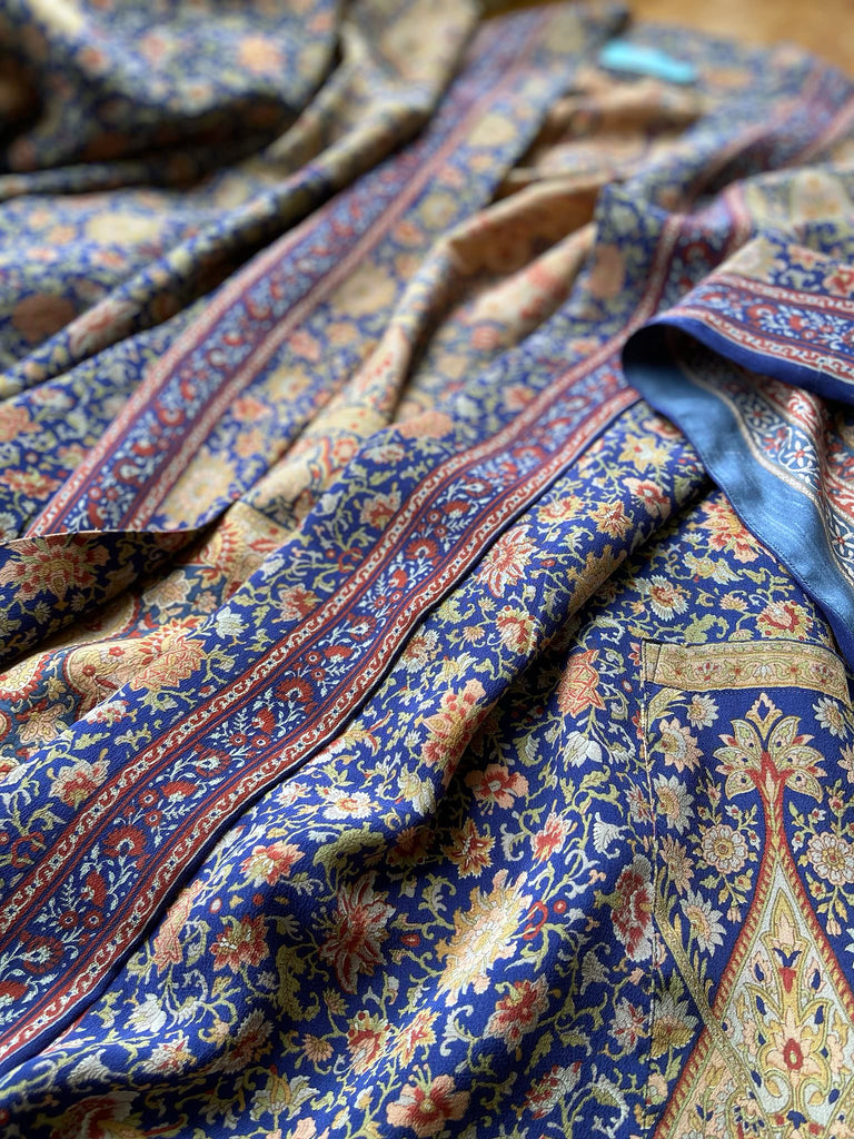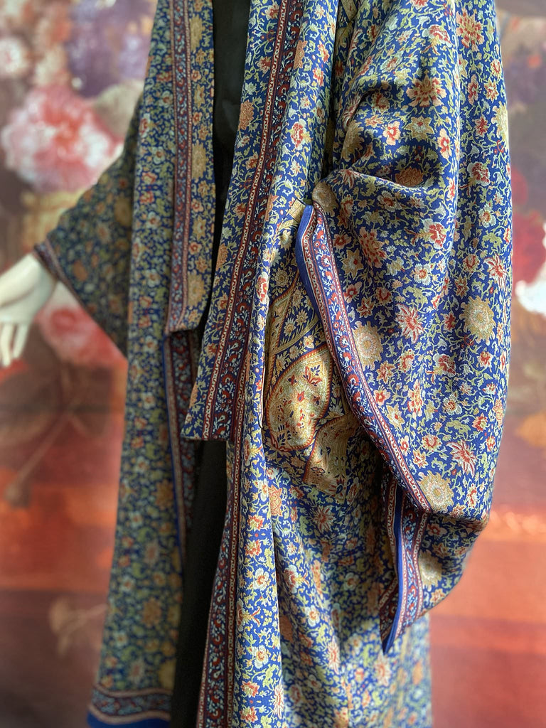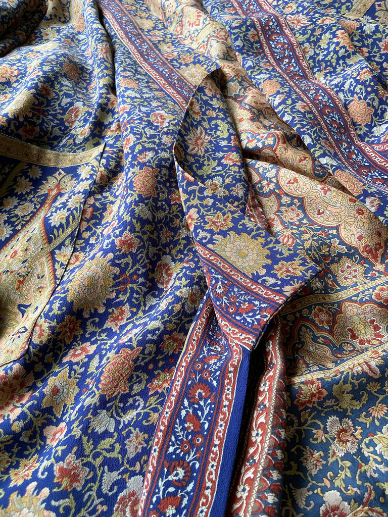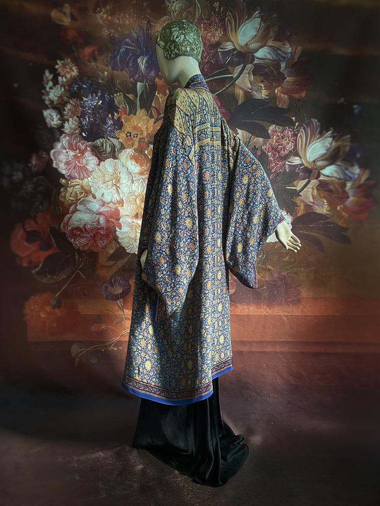 Constructed from a length of boldly patterned silk crepe with an intricate printed Indienne flower design of on a lapiz blue ground.