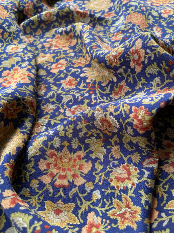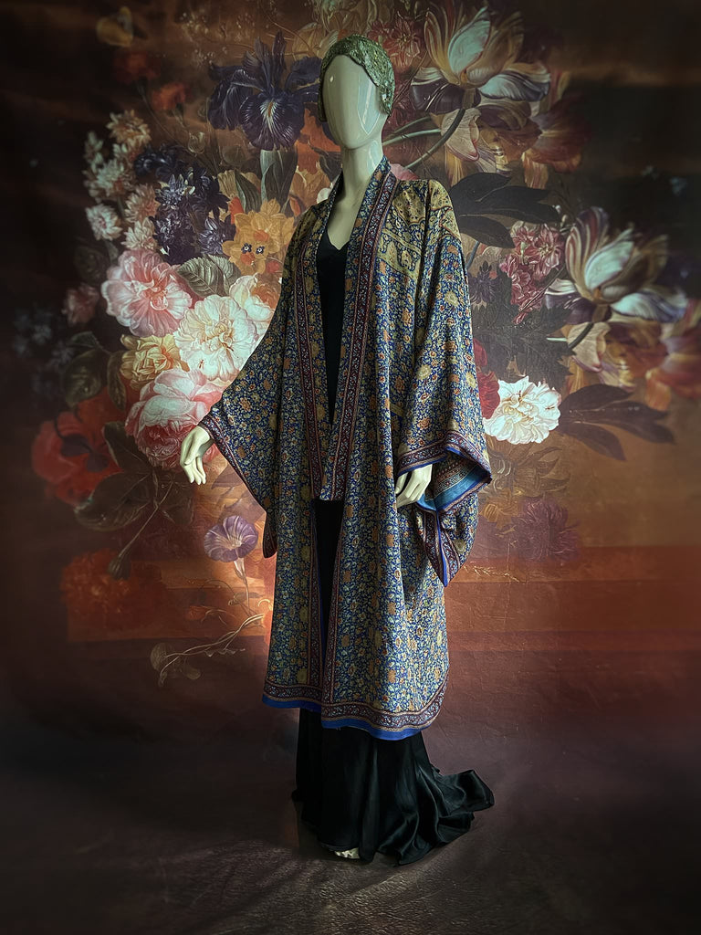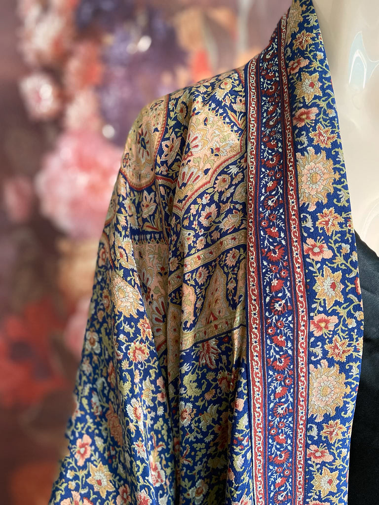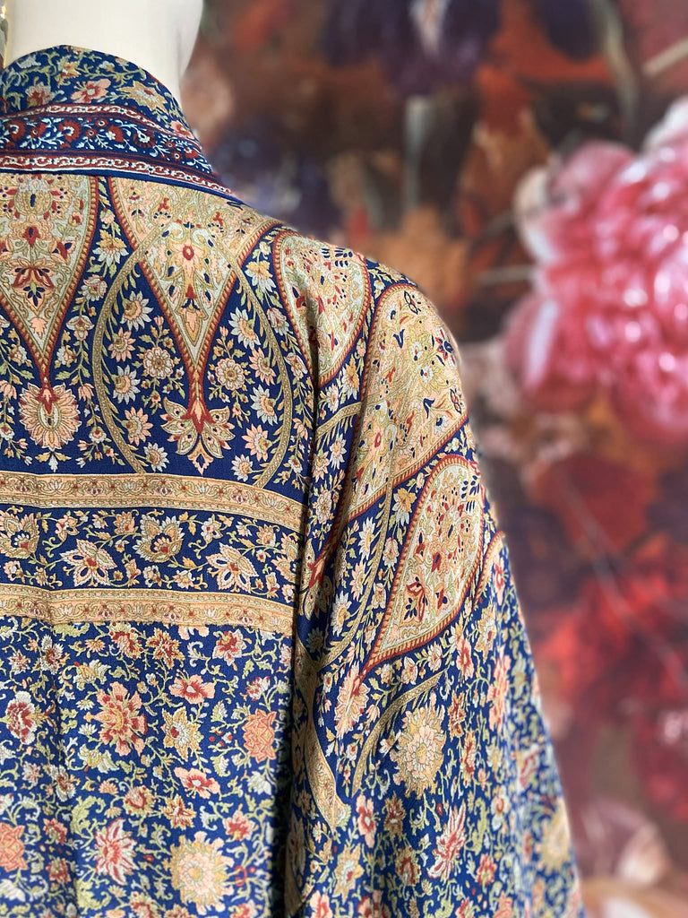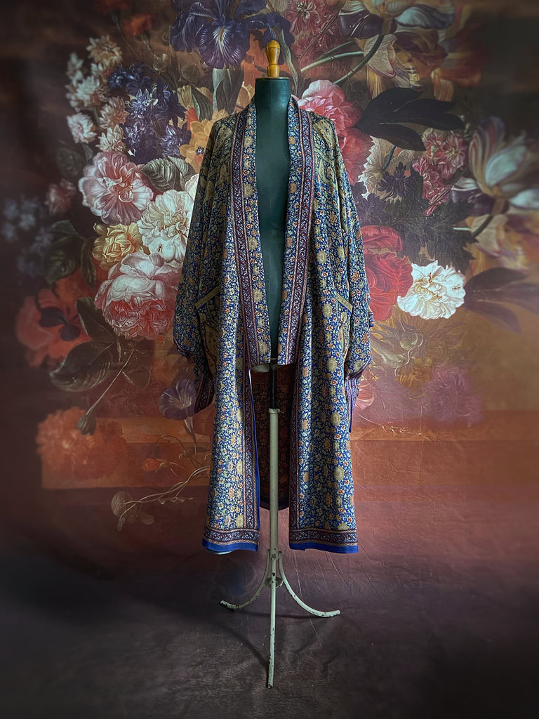 Constructed from a length of boldly patterned silk crepe with an intricate printed Indienne flower design of on a lapiz blue ground.
