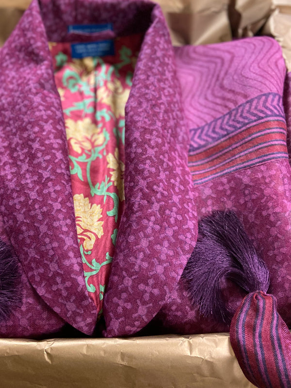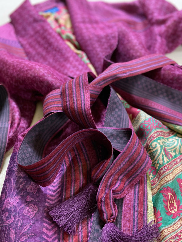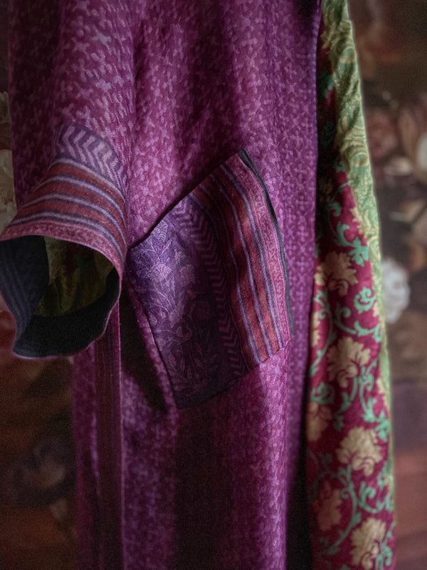 Each of these pieces is created from a vintage 100% wool saree. The design is very considered, with the cut engineered to make the best use of the various areas of beautiful printed design on the saree. I will spend some hours before cutting trying out different pattern layouts to ensure the most pleasing finished effect.