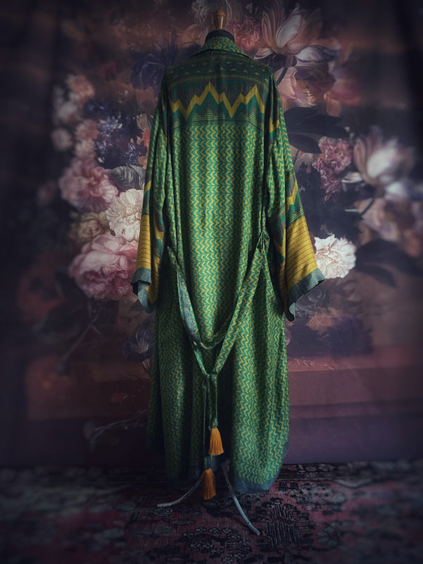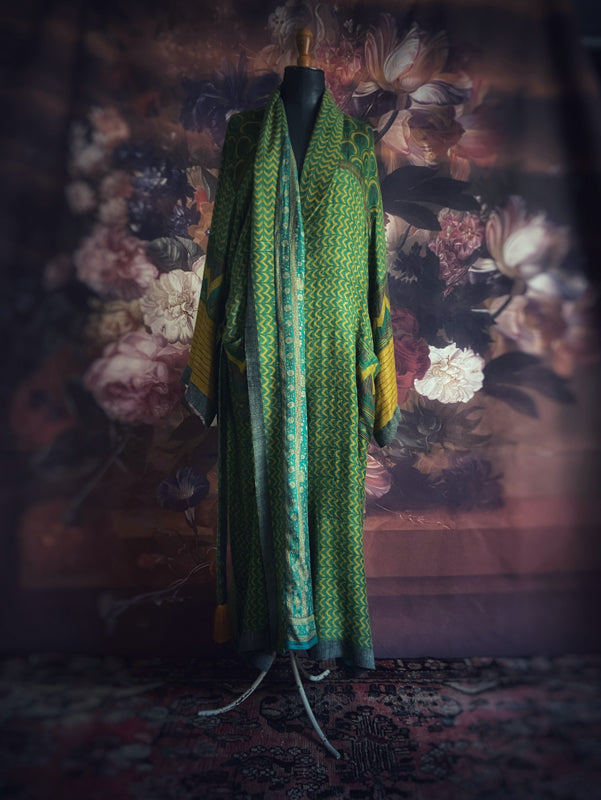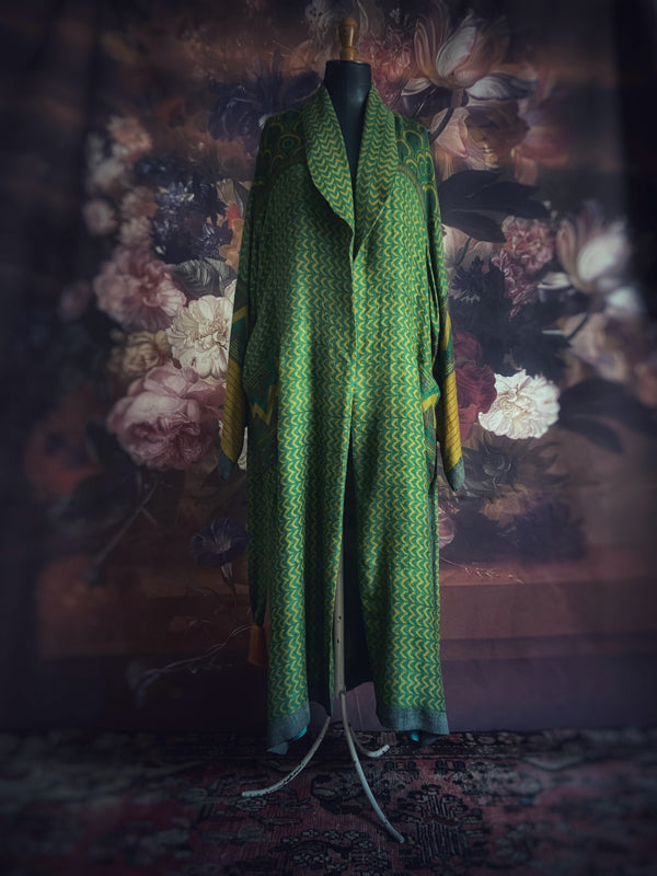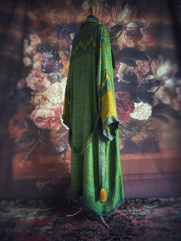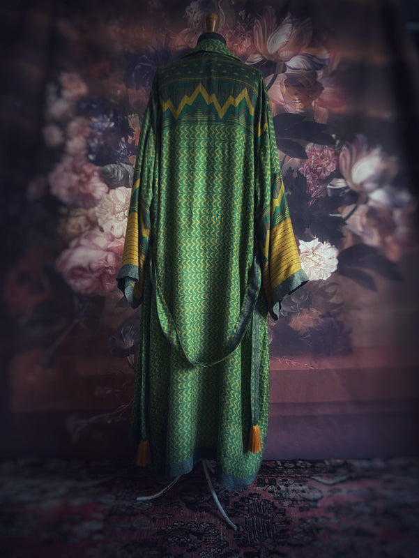 A striking long generously cut dressing robe or duster coat with patch pockets and wide sleeves. Can be worn loose, or drawn in at at the waist with the long sash, finished with silky tassels.