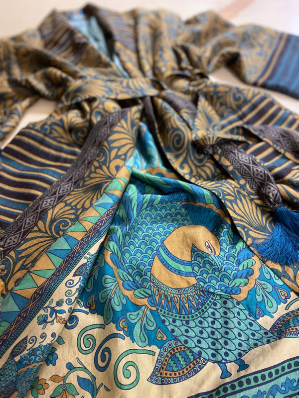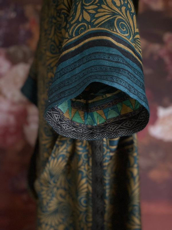 Each of these pieces is created from a vintage 100% wool saree. The design is very considered, with the cut engineered to make the best use of the various areas of beautiful printed design on the saree.  I will spend some hours before cutting trying out different pattern layouts to ensure the most pleasing finished effect.
