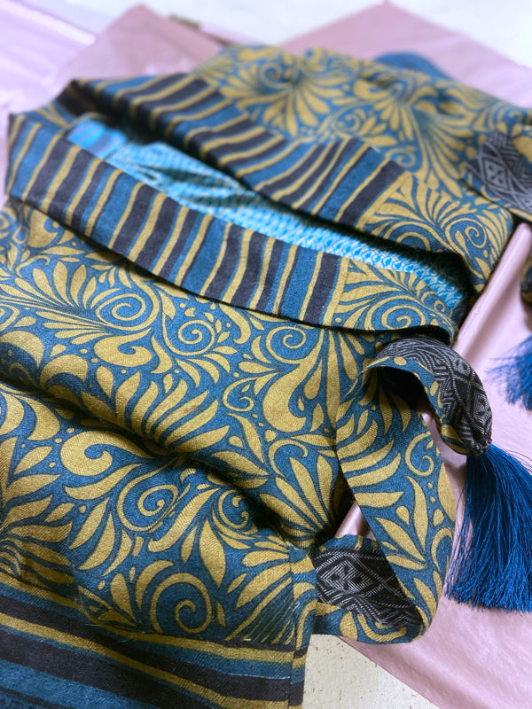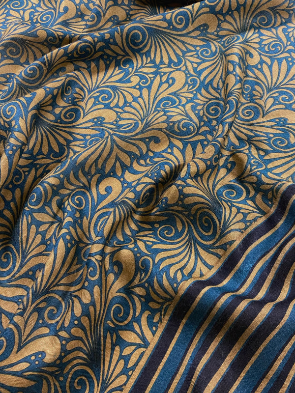 Supple fluid very lightweight fine. Banded geometric accents in complementary tones. Created from a carefully selected vintage wool saree.
