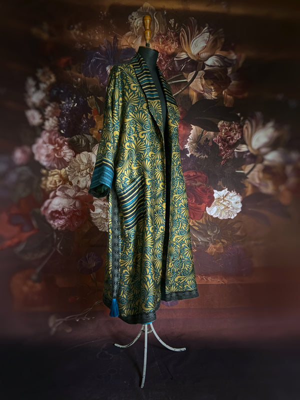 A striking long generously cut dressing robe or duster coat with patch pockets and wide sleeves. Can be worn loose, or drawn in at at the waist with the long sash, finished with silky tassels.