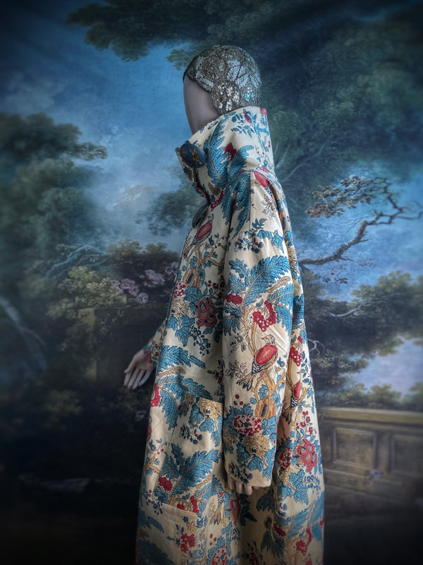 Each of these pieces is created from vintage textiles. The design is very considered, with the cut engineered to make the best use of the various areas of beautiful printed design on the length. I will spend some hours before cutting trying out different pattern layouts to ensure the most pleasing finished effect.