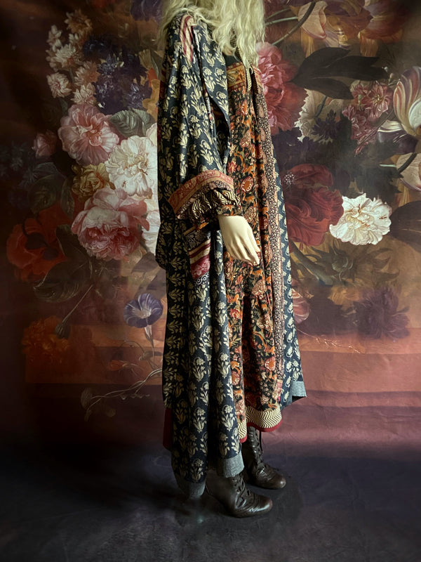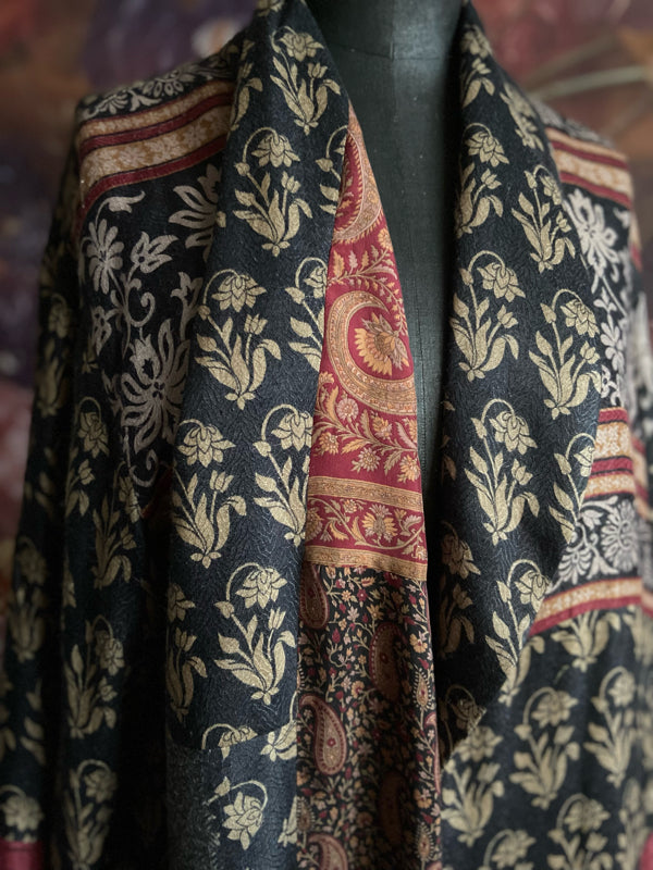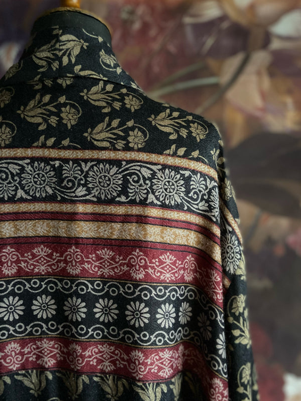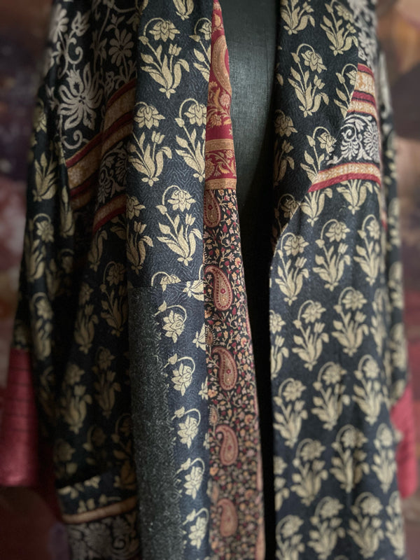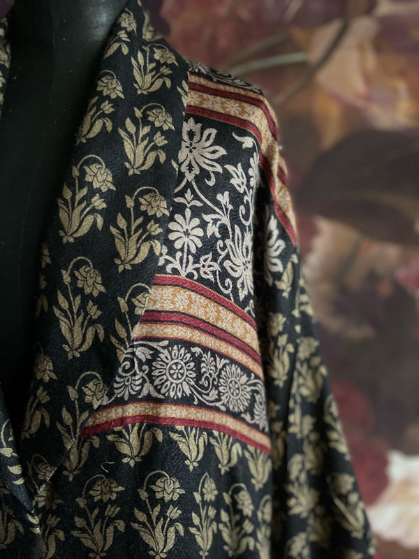 Each of these pieces is created from a vintage 100% wool saree. The design is very considered, with the cut engineered to make the best use of the various areas of beautiful printed design on the saree. I will spend some hours before cutting trying out different pattern layouts to ensure the most pleasing finished effect.