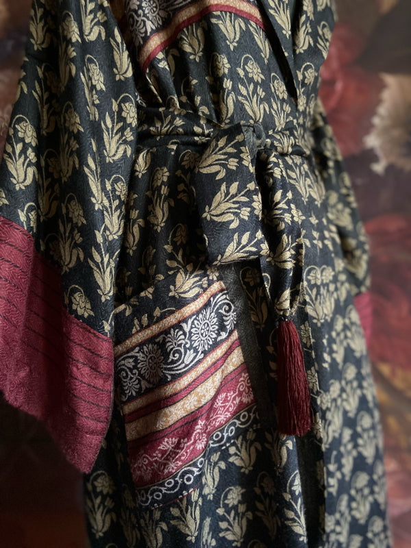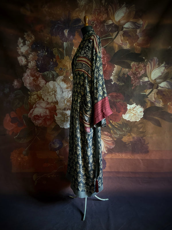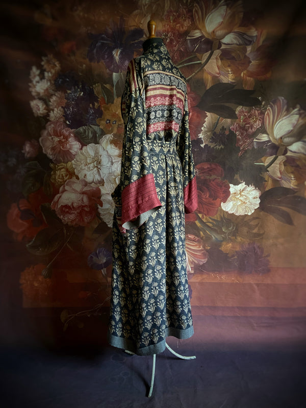 A striking long generously cut dressing robe with patch pockets and wide sleeves. Can be worn loose, or drawn in at at the waist with the long sash, finished with silky tassels.