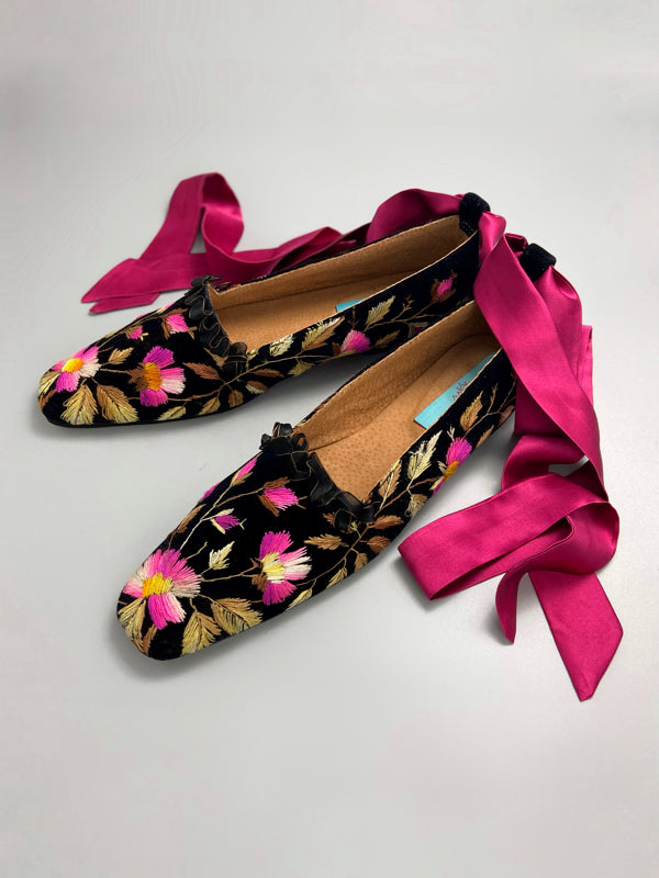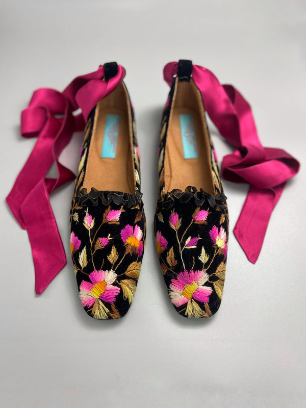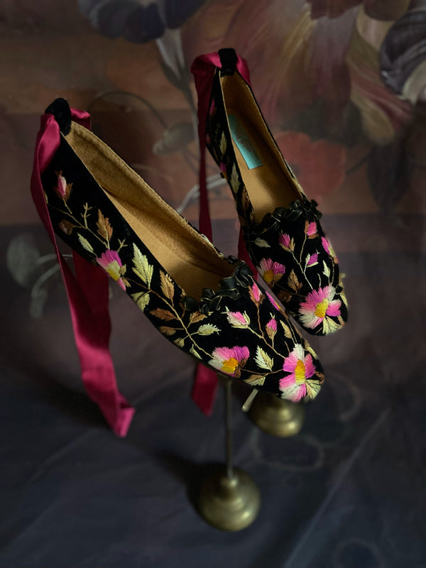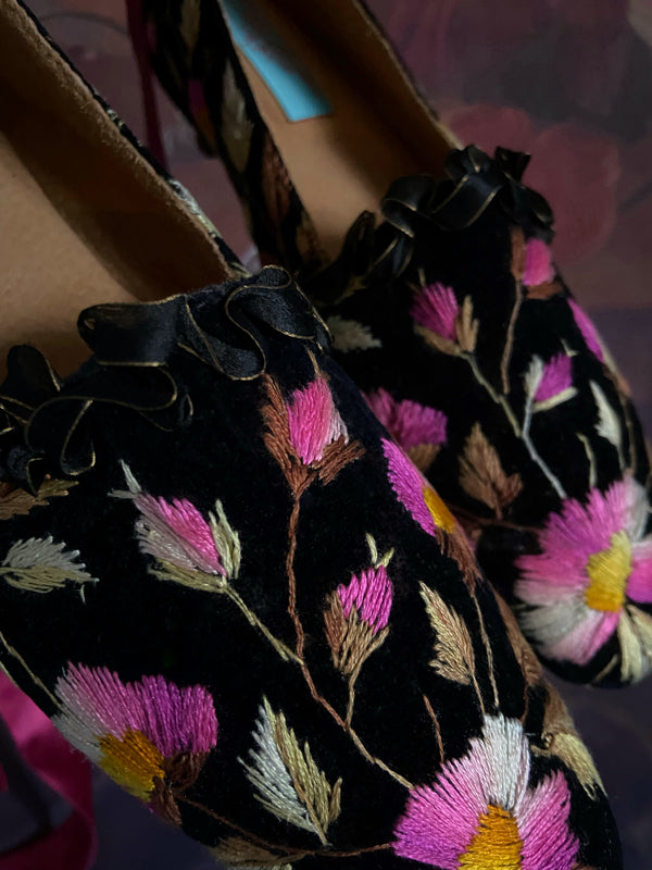 Created from an original pair of antique hand embroideries on black velvet that were intended to be made up into slippers but had never gotten that far.