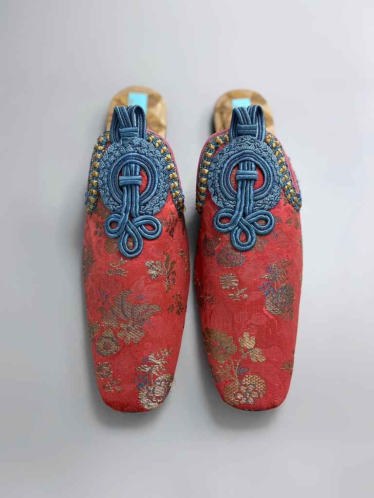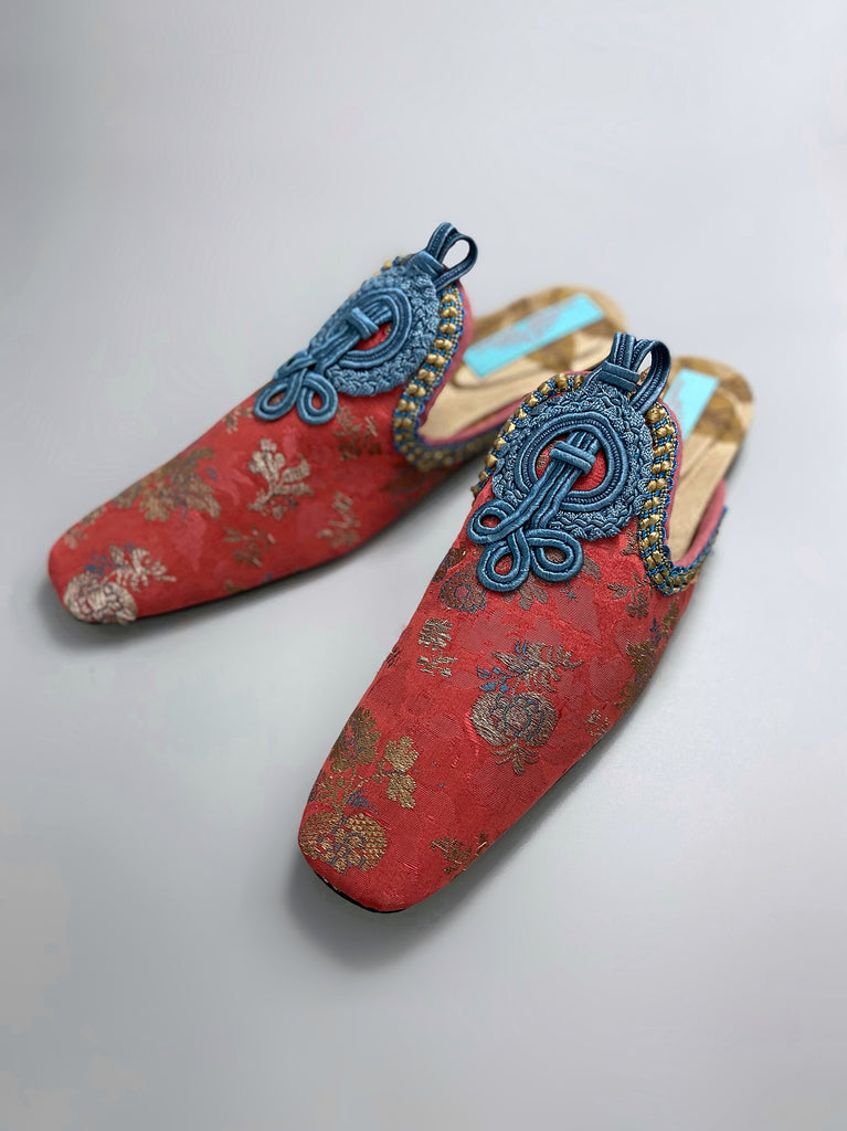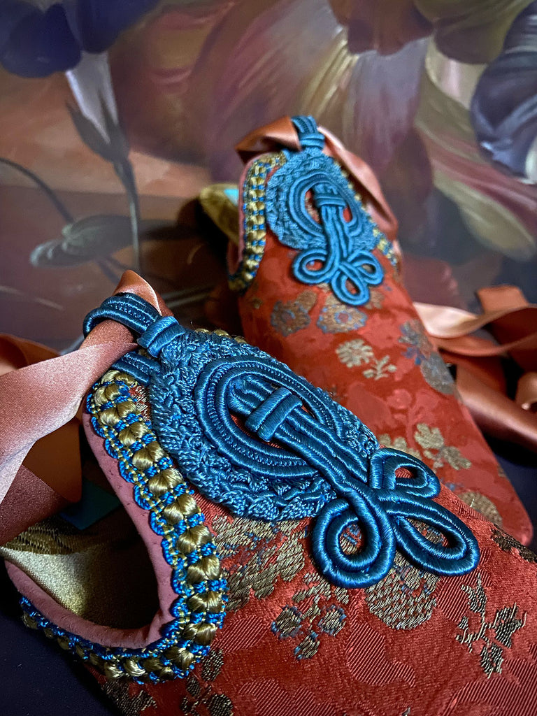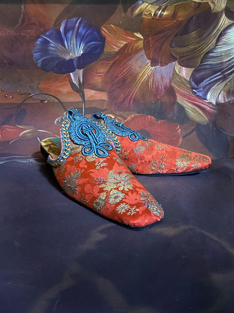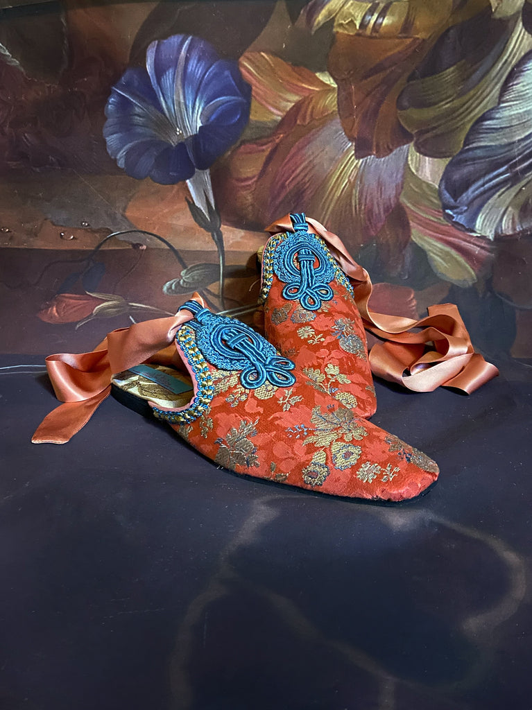 The ingredients Please be aware that these shoes are created from antique textiles, which have often had a previous life extending back centuries, so consequently there may be the odd minor smudge or tiny pin prick to the surface of the fabric. These in no way impinge on their beauty, and you can be sure that they do not compromise the integrity of the material. Any little area of actual damage or thinning is repaired with a tiny embroidered patch (one of my favourite features!), and this is always clearly mentioned in the description.