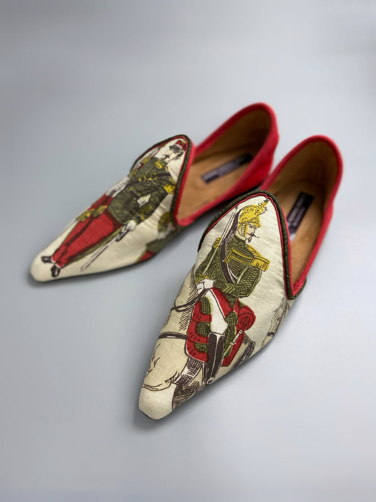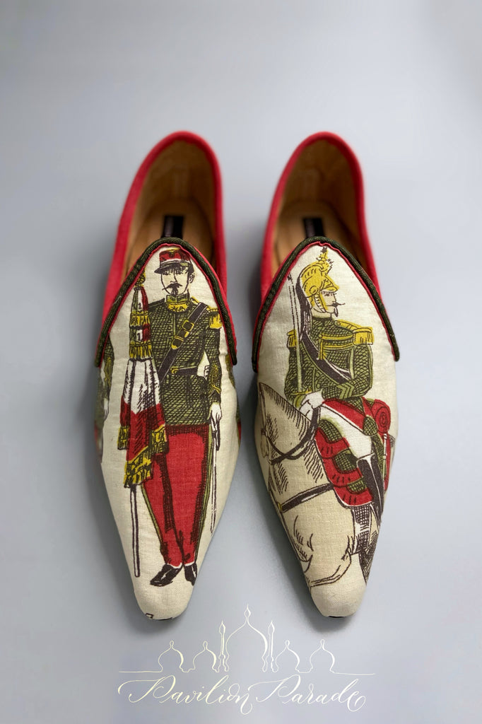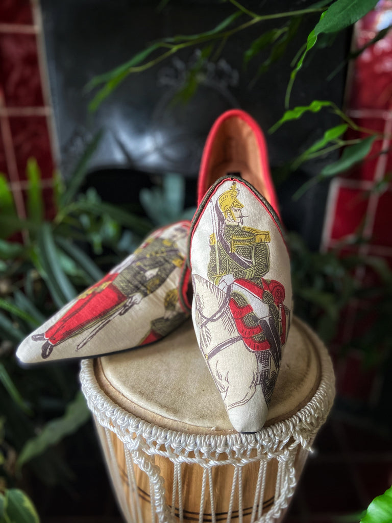 Created from a length of vintage 1950s screen printed French linen featuring a dashing French cavalry officers with plumed helmet on one shoe, and a smart wasp waisted standard bearer on the other.