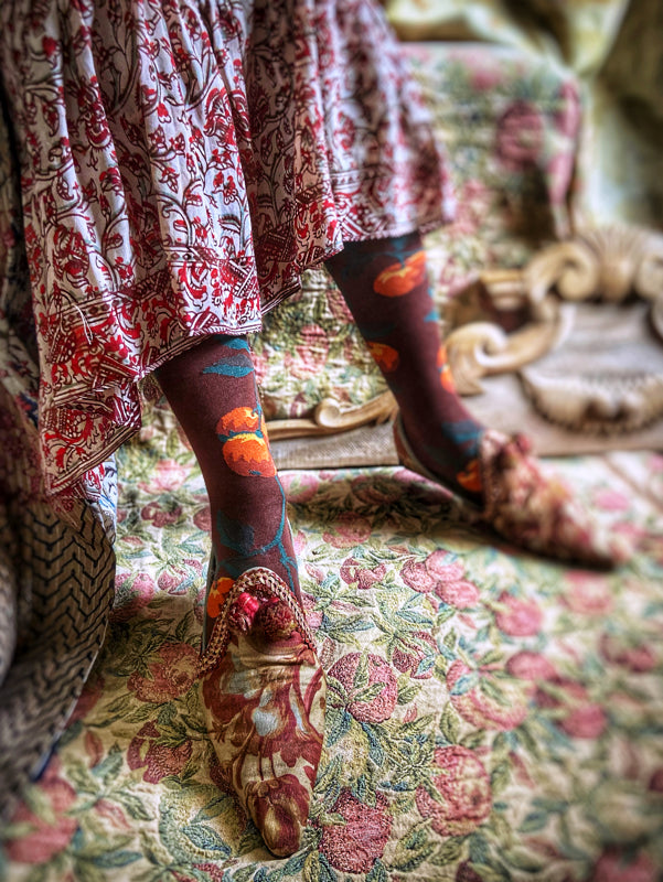 The ingredients Please be aware that these shoes are created from antique textiles, which have often had a previous life extending back centuries, so consequently there may be the odd minor smudge or tiny pin prick to the surface of the fabric. These in no way impinge on their beauty, and you can be sure that they do not compromise the integrity of the material. Any little area of actual damage or thinning is repaired with a tiny embroidered patch (one of my favourite features!), and this is always clearly mentioned in the description.