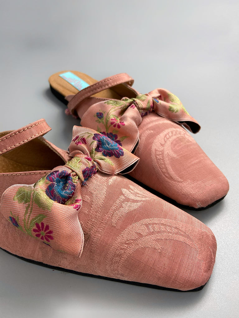 The ingredients Please be aware that these shoes are created from or incorporate antique textiles, which have often had a previous life extending back centuries, so consequently there may be the odd minor smudge or tiny pin prick to the surface of the fabric. These in no way impinge on their beauty, and you can be sure that they do not compromise the integrity of the material. Any little area of actual damage or thinning is repaired with a tiny embroidered patch (one of my favourite features!), and this is always clearly mentioned in the description.