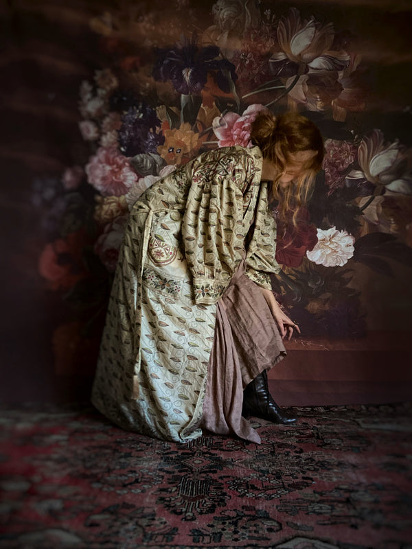 Chacune de ces pièces est créée à partir d'un sari vintage 100 % laine. Le design est très réfléchi, avec la coupe conçue pour tirer le meilleur parti des différentes zones de beau design imprimé sur le sari. Je passerai quelques heures avant de couper à essayer différentes dispositions de motifs pour assurer l'effet fini le plus agréable.