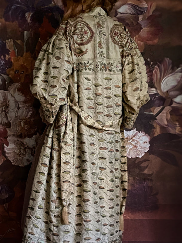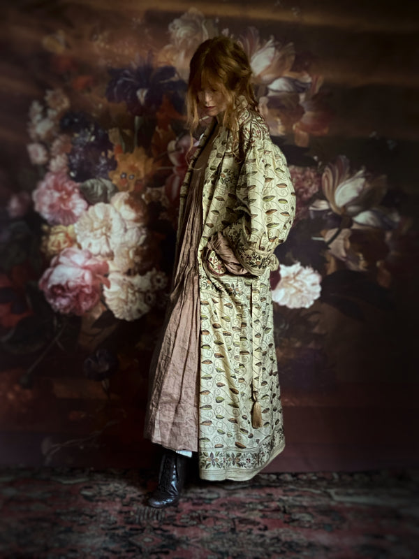 Une longue robe de chambre ou un cache-poussière saisissant à la coupe généreuse avec des poches plaquées et des manches larges. Peut être porté ample ou resserré à la taille grâce à la longue ceinture ornée de pompons soyeux.