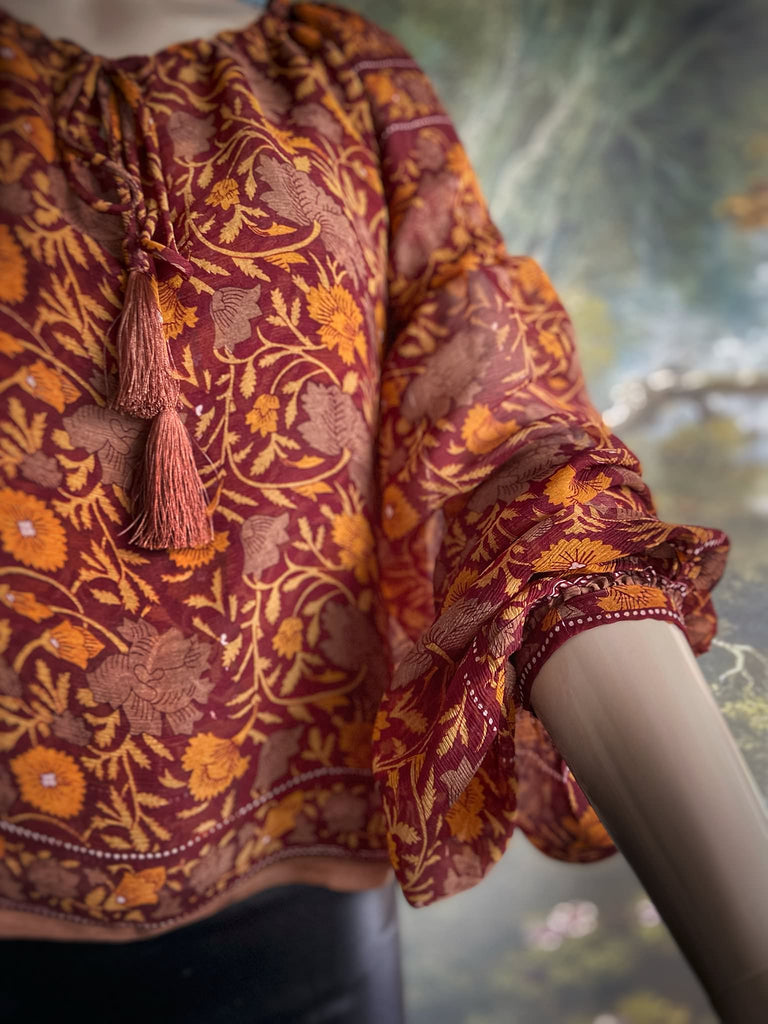 The top layer is a translucent silk georgette printed with a William Morris reminiscent Indian stylised floral motif in pumpkin and sienna on a cinnamon ground.