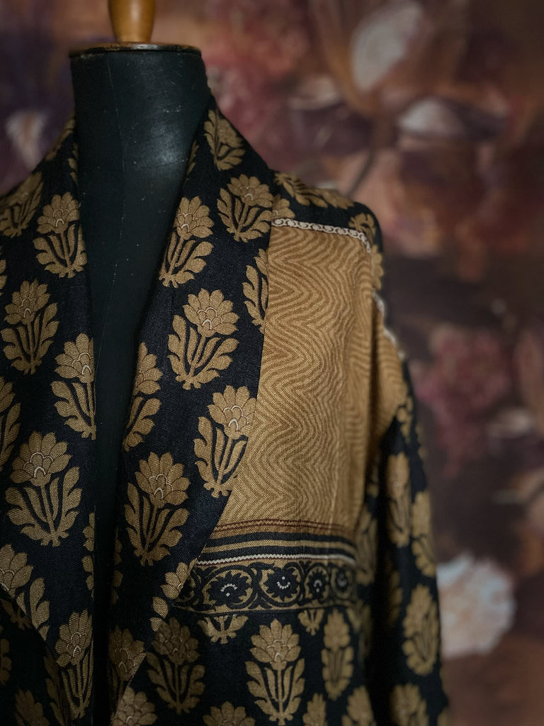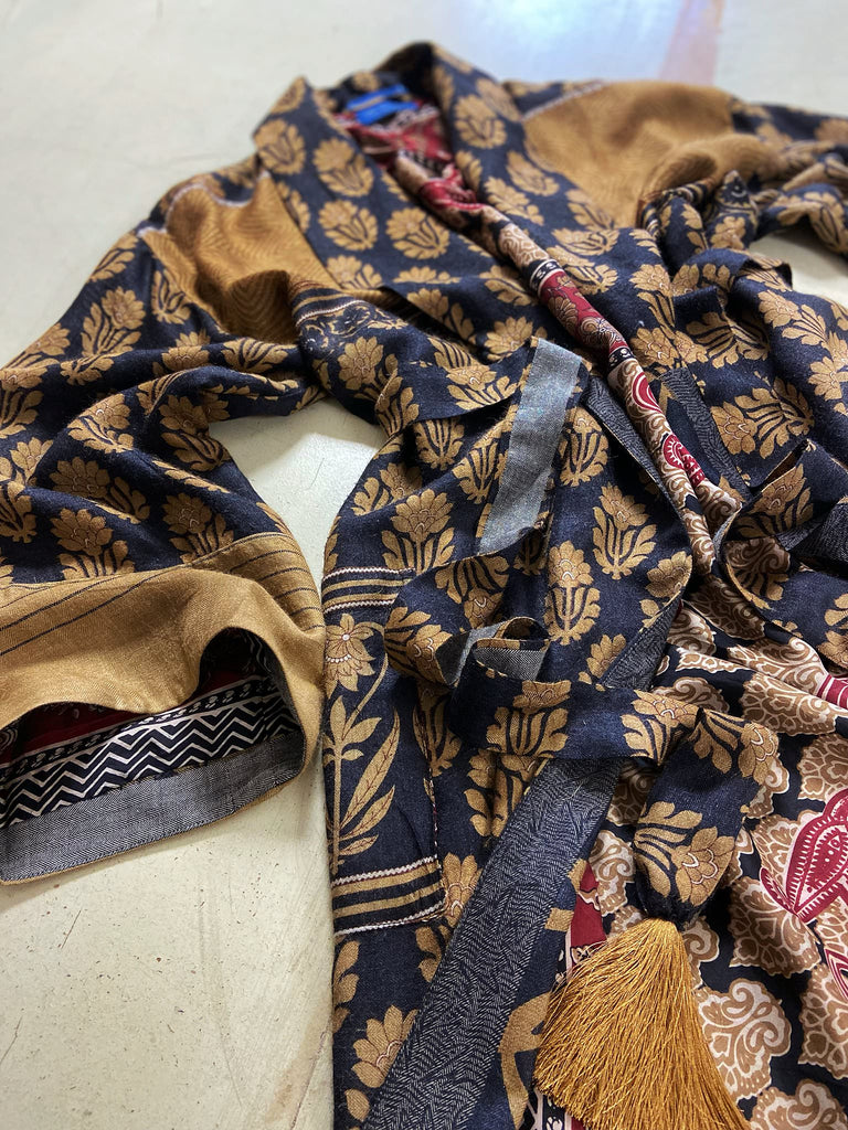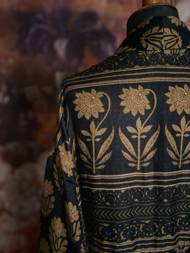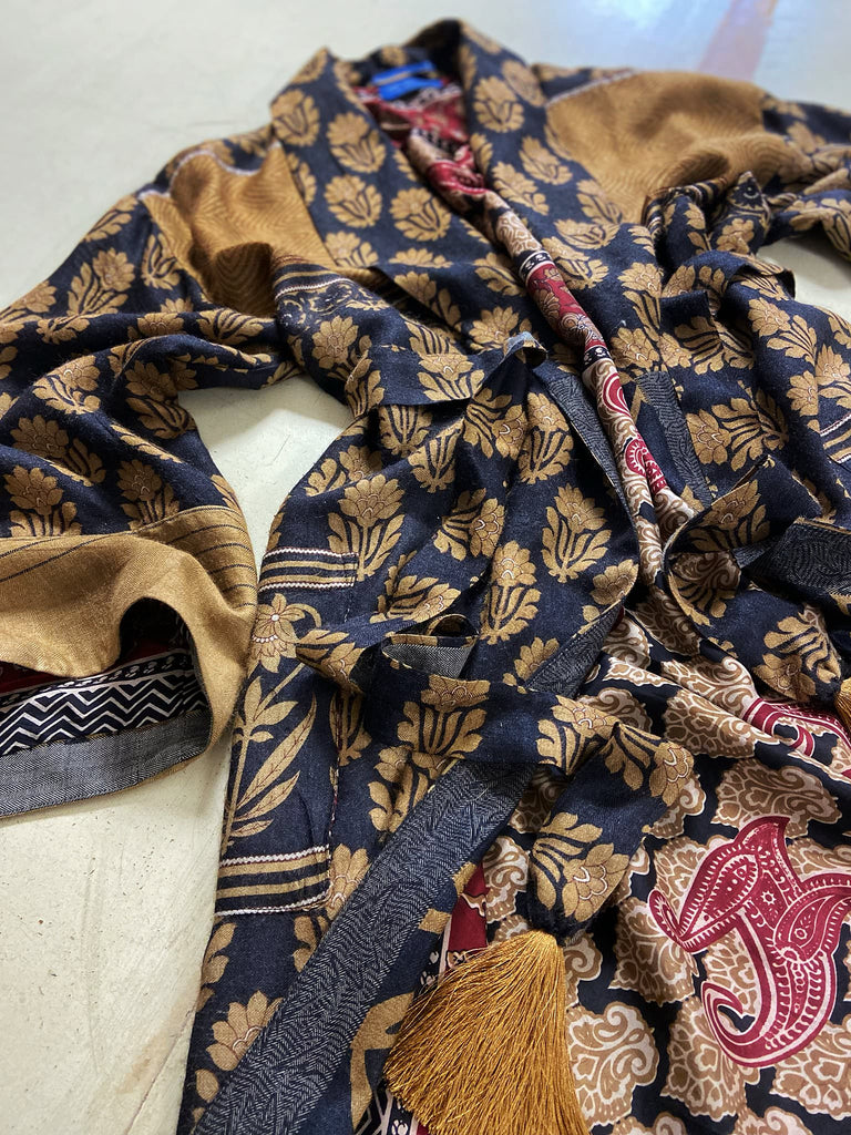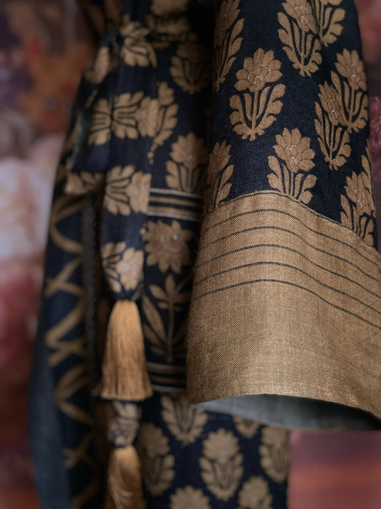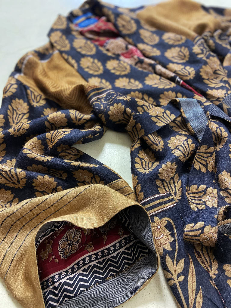Supple fluid very lightweight wool twill with a block printed stylised floral motif in ochre on a charcoal black ground. Banded accents in the same tones. Created from a carefully selected vintage wool saree.