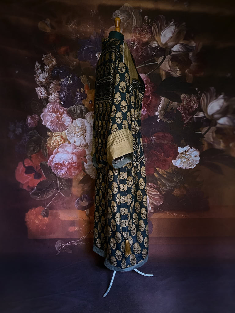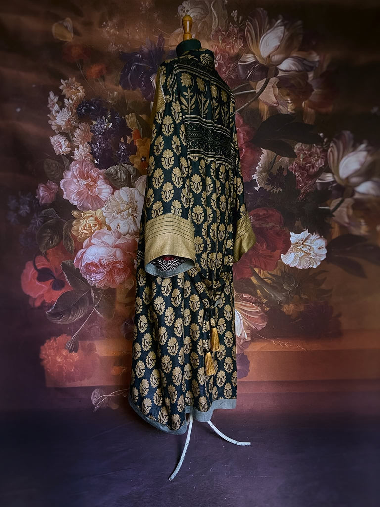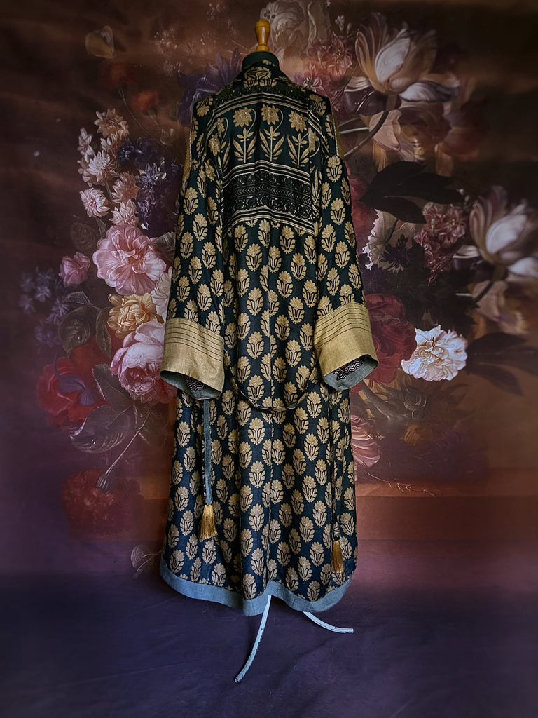 A striking long generously cut dressing robe or duster coat with patch pockets and wide sleeves. Can be worn loose, or drawn in at at the waist with the long sash, finished with silky tassels.